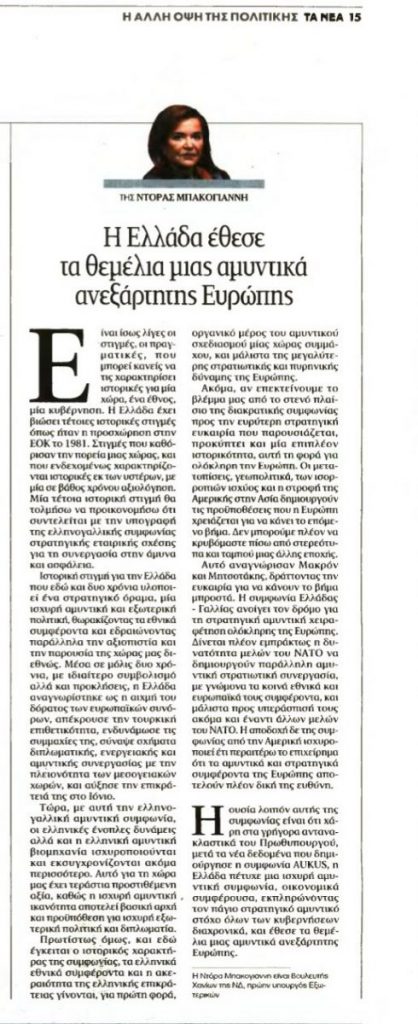Άρθρο Ντόρας Μπακογιάννη στην εφημερίδα “ΤΑ ΝΕΑ” για την Ελληνογαλλική Συμφωνία